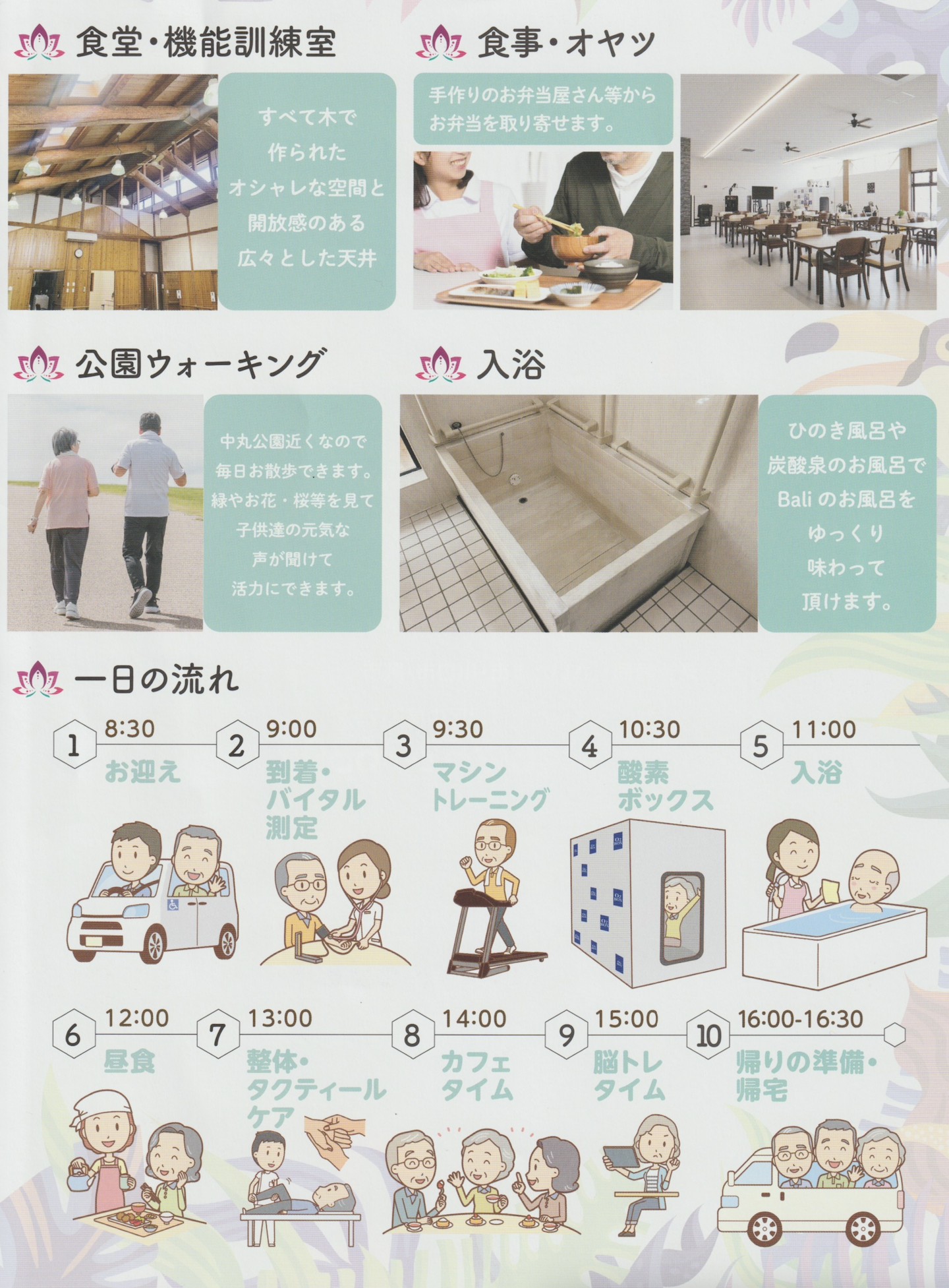 半日のご利用でも入浴やお食事をお楽しみ頂けるので、お1人お1人の生活に沿ったご利用が可能です。
